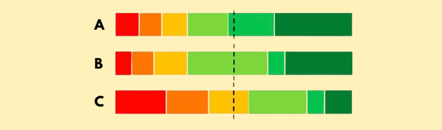 Depois dos votos, é calculada a classificação mediana de cada candidato, dividindo o eleitorado em duas partes, como no pontilhado da figura abaixo.