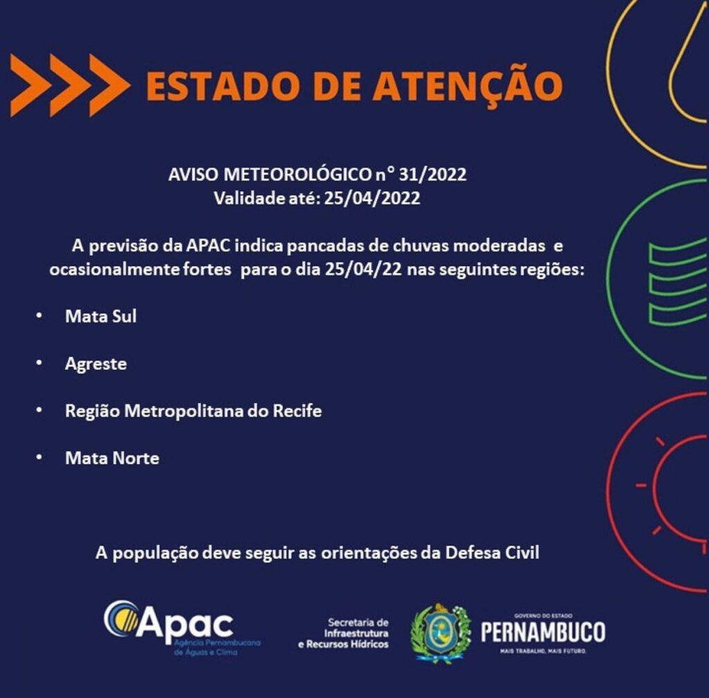 De acordo com a Agência Pernambucana de Águas e Clima, um sistema meteorológico, conhecido como Perturbação Ondulatória dos Alísios (POA), poderá levar nebulosidades para a região do litoral pernambucano, causando instabilidades durante a segunda-feira (25) provocando pancadas de chuvas com intensidade moderada e ocasionalmente fortes.