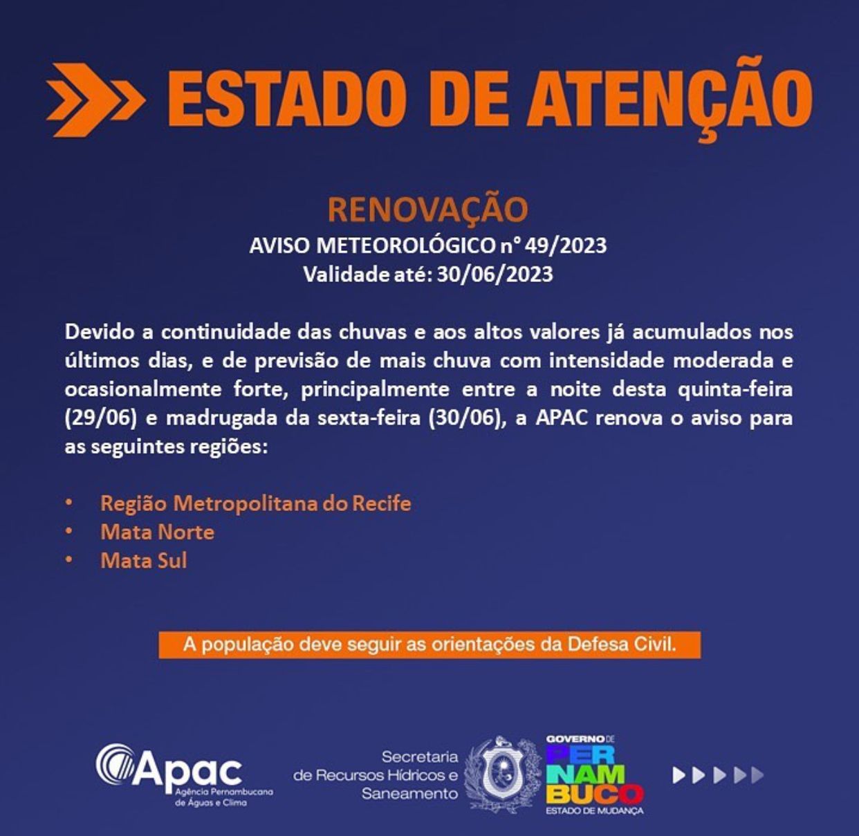 Há previsão de chuvas para o Agreste, mas sem necessidade de aviso meteorológico, conforme a agência meteorológica. Não há previsão de chuvas para o Sertão, segundo a Apac.
