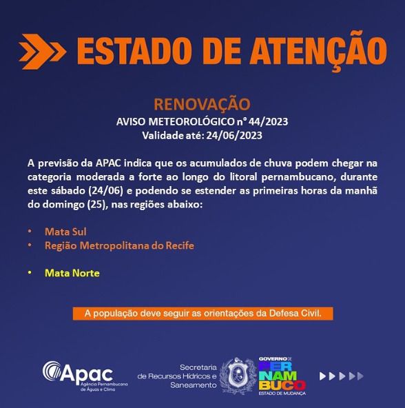 O aviso laranja, ou seja, de risco moderado a alto, é válido para a Região Metropolitana do Recife e a Zona da Mata Sul. Para a Zona da Mata Norte, o aviso é amarelo, de risco moderado.