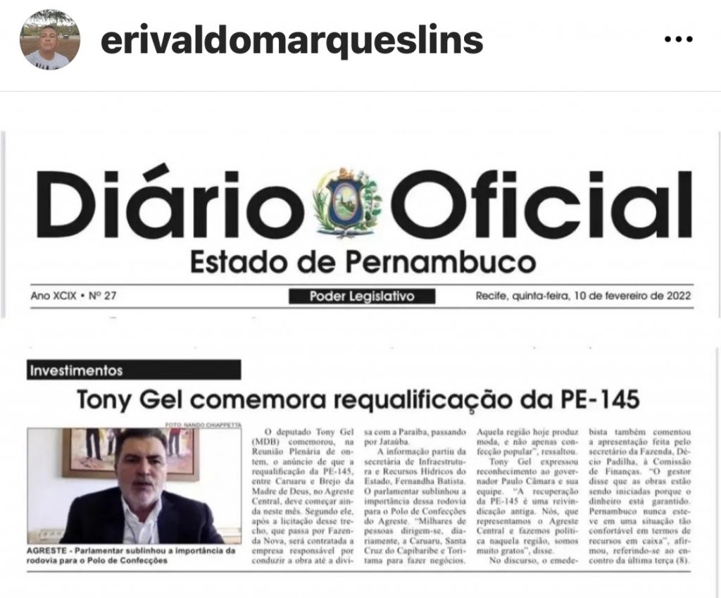 verdade da história. Em 03 de Dezembro de 2019, o Deputado Estadual Tony Gel já comemorava a abertura do processo de licitação para a restauração da PE-145 entre Caruaru e Brejo. O delegado Lessa só veio aparecer para falar do assunto em junho de 2021. Ou seja, enquanto ele pedia ao presidente do DER melhorias, Tony Gel já tinha pedido ao Governador Paulo Câmara a reconstrução da rodovia, já tinha sido atendido e a secretaria de Infraestrutura já havia inclusive aberto o processo de licitação. O que deixa claro que a PE-145 é uma luta antiga do deputado Tony Gel, e que o Deputado Lessa pegou carona”, postou Erivaldo.