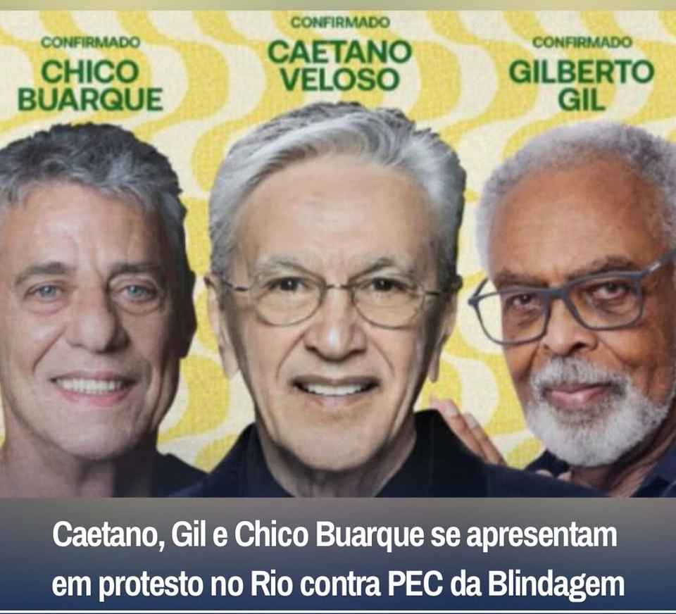 A orla de Copacabana será palco de um momento da música e da política nacional. Nesse domingo (21), artistas como Caetano Veloso, Gilberto Gil, Chico Buarque e Djavan vão dividir o palco em um ato contra a PEC da Blindagem e o PL da Anistia, em mobilização marcada para começar às 14h, na altura do Posto 5.