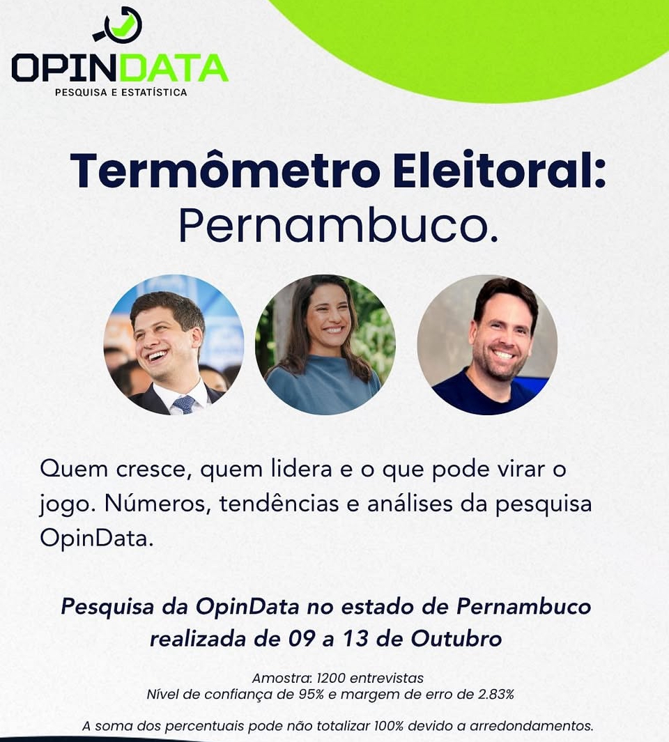 A mais recente rodada do Termômetro Eleitoral Pernambuco, realizada pela OpinData entre os dias 9 e 13 de outubro, revela que o prefeito do Recife, João Campos (PSB), mantém uma liderança sobre a governadora Raquel Lyra (PSD) nas intenções de voto para o Governo de Pernambuco. O levantamento ouviu 1.200 eleitores em todo o Estado e apresenta margem de erro de 2,83%, com nível de confiança de 95%.
