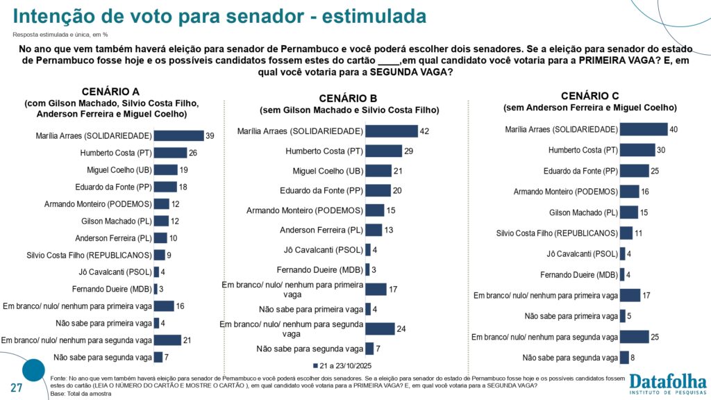 A mais recente pesquisa Datafolha divulgada nesta quarta-feira (29), encomendada pelas rádios CBN Recife e CBN Caruaru, mostra a ex-deputada federal Marília Arraes (Solidariedade) na liderança da corrida pelas duas vagas ao Senado Federal por Pernambuco nas eleições de 2026. O atual senador Humberto Costa (PT) aparece em segundo lugar em todos os cenários estimulados.