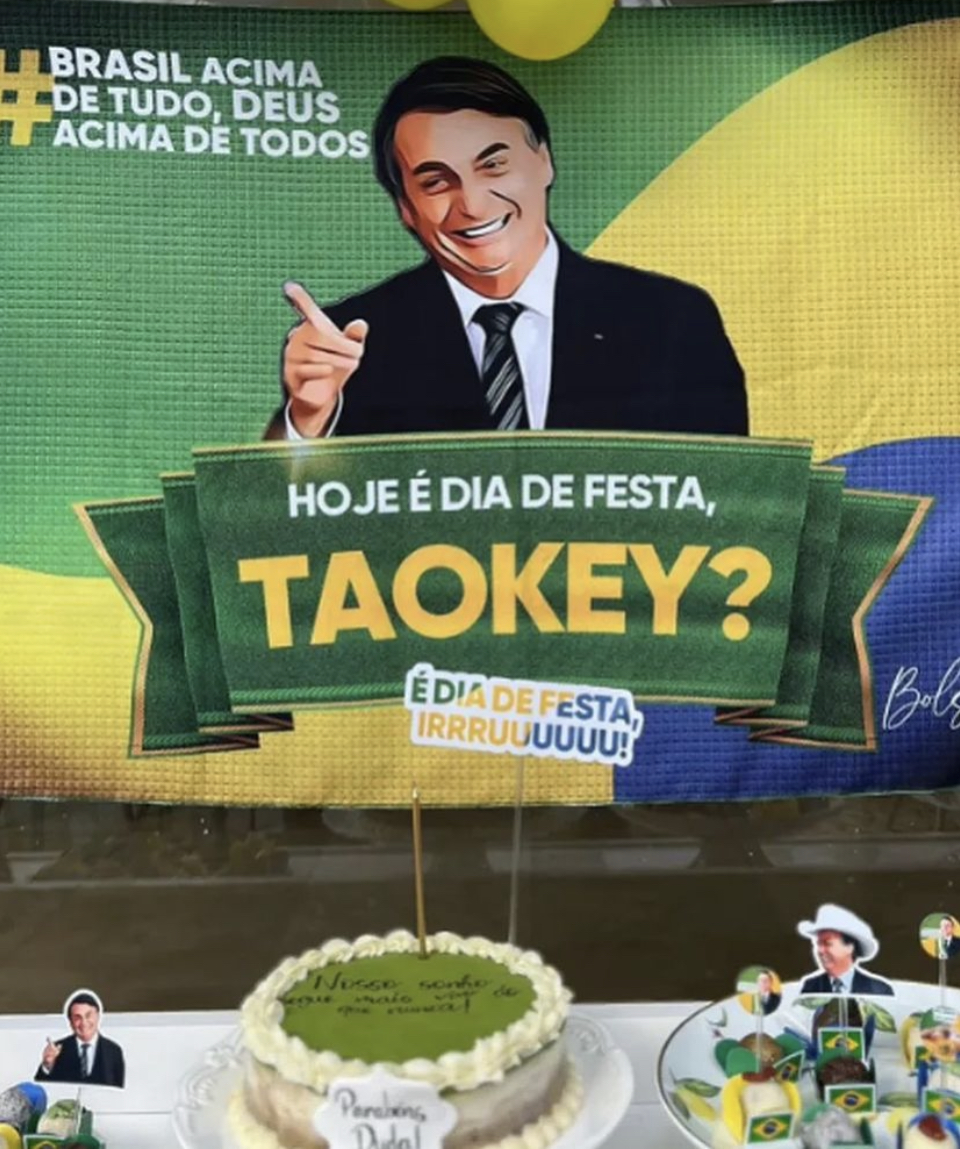 O kit para aniversário inclui um painel com o rosto do ex-presidente Jair Bolsonaro acompanhado da frase “Hoje é dia de festa, taokey?”.