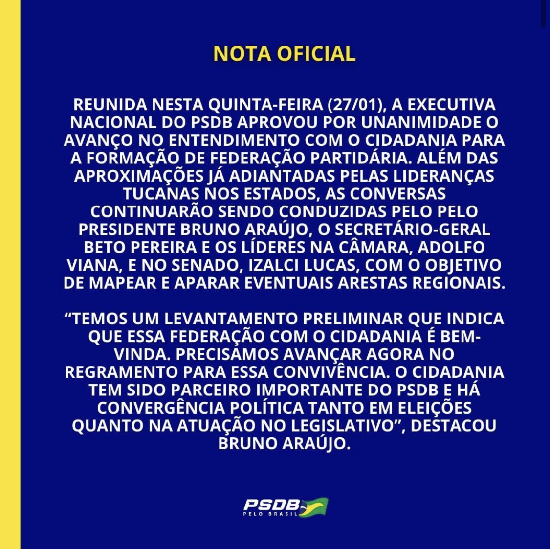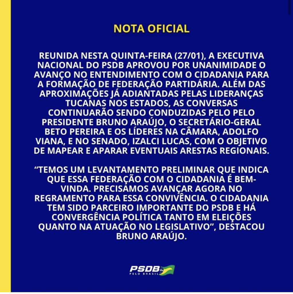 “Líderes tucanos defenderam ainda que a decisão final sobre a Federação com o Cidadania seja tomada o quanto antes, para que também se definam mais rapidamente a formação das chapas