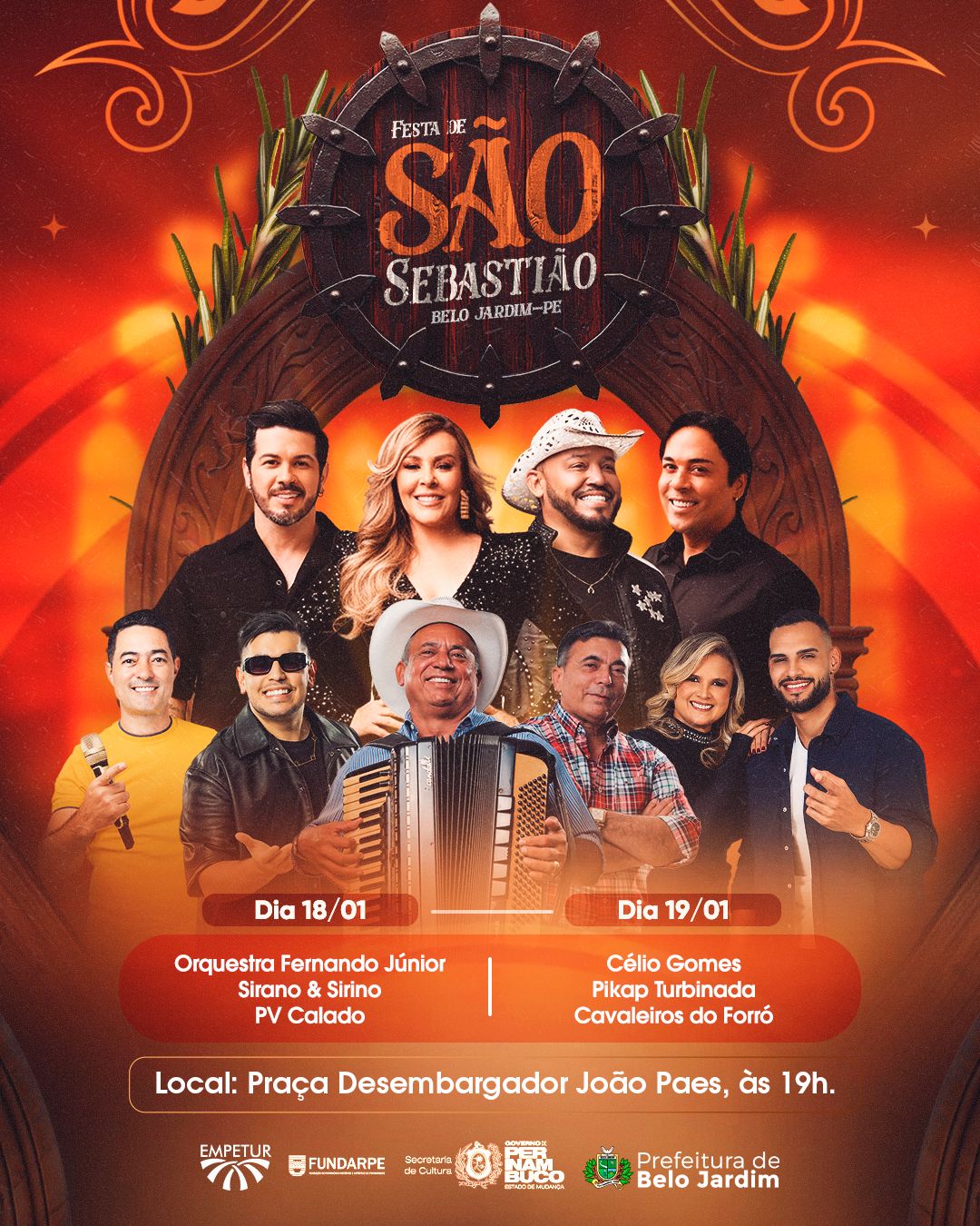 A Prefeitura de Belo Jardim promove, nos dias 18 e 19 de janeiro, a tradicional Festa de São Sebastião, co-padroeiro do município. O evento será realizado a partir das 19h, na Praça da Cultura Desembargador João Paes, reunindo moradores e visitantes em dois dias de celebração, fé, cultura e entretenimento. A festa é organizada pela Secretaria de Cultura, Turismo e Empreendedorismo, com apoio da Empetur, da Fundarpe e do Governo de Pernambuco.
