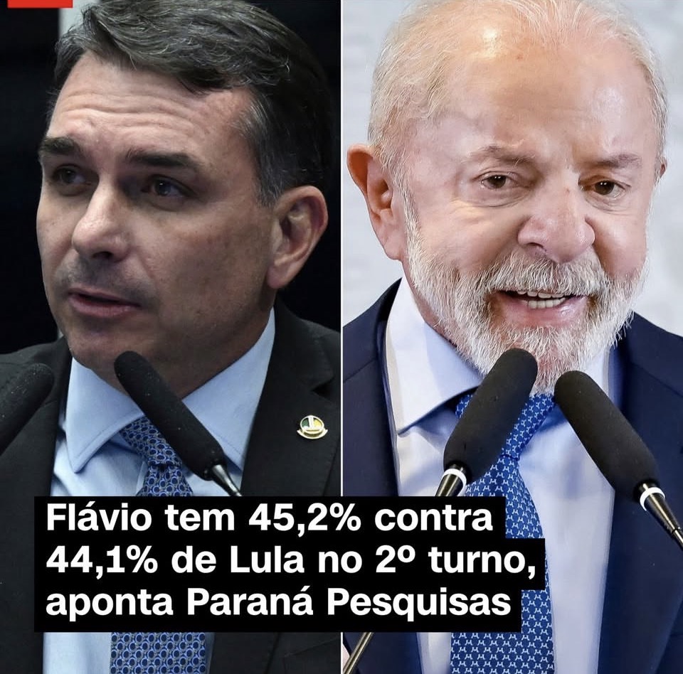 O senador Flávio Bolsonaro (PL-RJ) e o presidente Luiz Inácio Lula da Silva (PT) estão em empate técnico em um eventual segundo turno da eleição presidencial de 2026. É o que aponta levantamento do Paraná Pesquisas divulgado nesta segunda-feira (30).