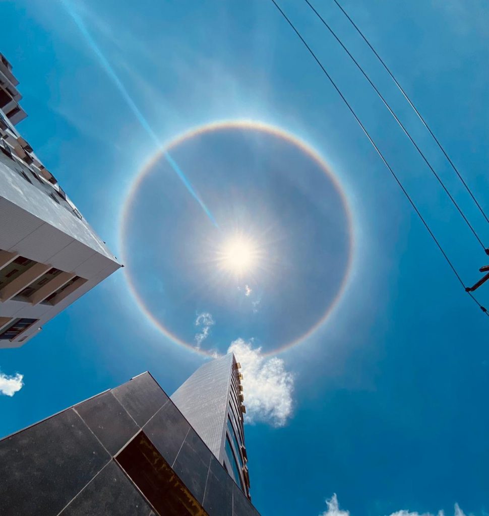 O fenômeno, que ocorreu após os mais de 30 milímetros de chuva que caíram no Grande Recife, resulta em um arco-íris ao redor do sol e também pode ser observado em cidades da Zona da Mata e do Agreste do estado.