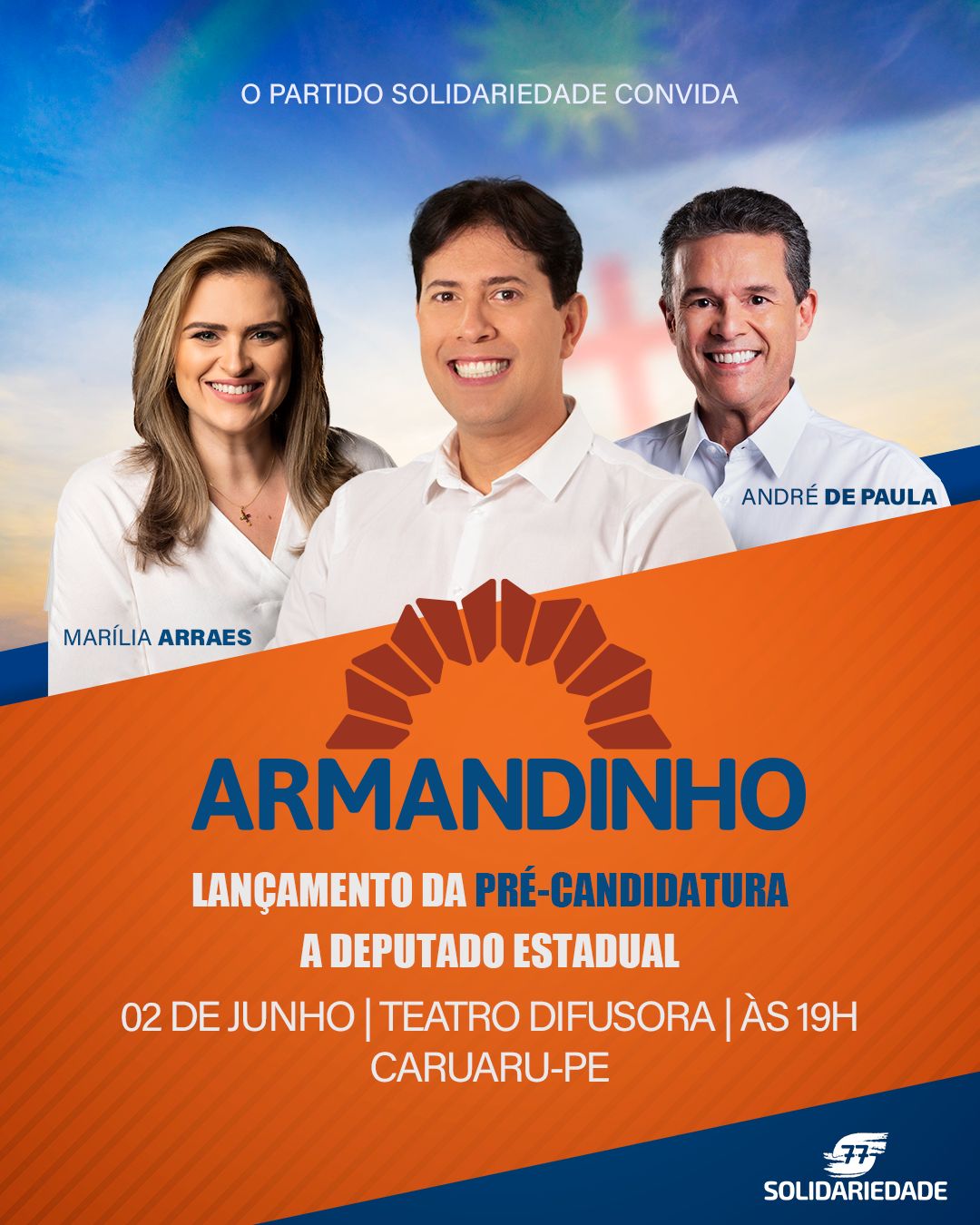 O partido Solidariedade realizará no próximo dia 02 de junho (quinta-feira) às 19h, no Teatro Difusora, em Caruaru, o lançamento da pré-candidatura à Deputado Estadual de Armandinho. O evento vai contar com as presenças da pré-candidata ao Governo de Pernambuco, Marília Arraes, e do pré-candidato ao Senado, André de Paula.