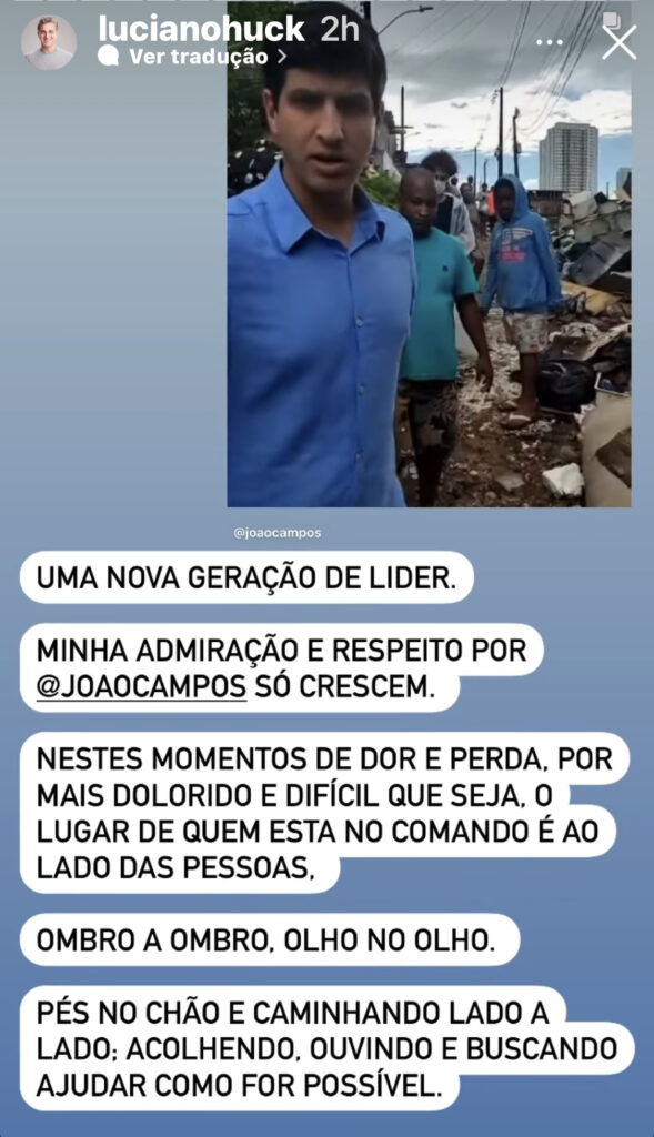 O apresentador da Tv Globo e um dos realizadores do projeto RenovaBR, Luciano Huck, não poupou elogios ao prefeito do Recife, João Campos (PSB), sobre a maneira que ele vem agindo diante da tragédia no Recife.
