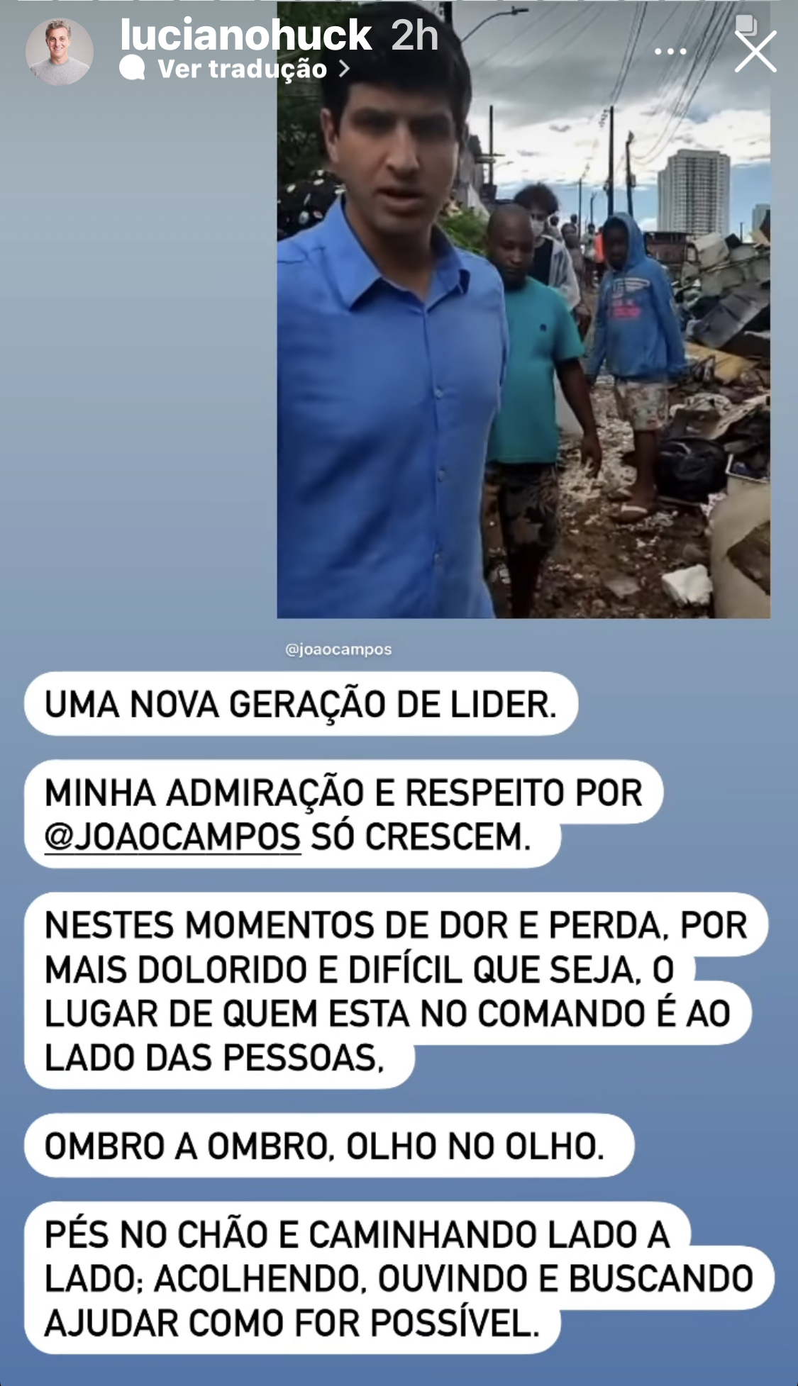 Luciano postou no Instagram uma foto de João Campos em meio ao povo e disse que é um novo perfil de político. “Ao lado das pessoas. “Uma nova geração de líder”, escreveu o apresentador da TV Globo.