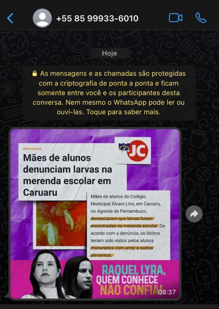 Eleitores de Caruaru e região estão recebendo disparos de mensagens contra a campanha da candidata ao governo de Pernambuco pelo PSDB, Raquel Lyra. Os torpedos chegam via SMS e WhatsApp de números do Ceará e outros estados, com montagens de reportagens sobre assuntos da época em que a tucana governou Caruaru.