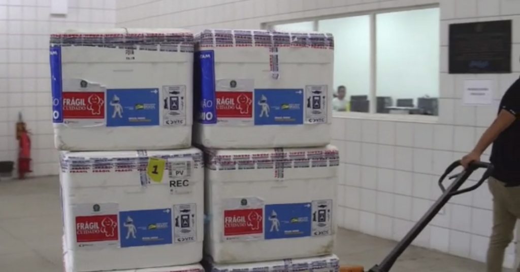 Pernambuco recebeu a primeira remessa de vacinas Coronavac/Butantan destinadas à aplicação em crianças de 6 a 11 anos – tanto as primeiras doses como as segundas doses. As 108.240 doses chegaram ao Estado em dois voos comerciais nesta quarta-feira (26/01). Do Aeroporto Internacional do Recife/Guararapes – Gilberto Freyre, os lotes seguiram para a sede do Programa Estadual de Imunização (PEI-PE), na Zona Norte da capital pernambucana, para checagem e divisão por município. Além da remessa de Coronavac, chegou no Estado, na madrugada de hoje, uma nova remessa de vacinas pediátricas da Pfizer, com 87 mil doses do imunizante. Com essas novas 195.240 doses, Pernambuco contemplará 15,4% do público infantil entre 5 e 11 anos.