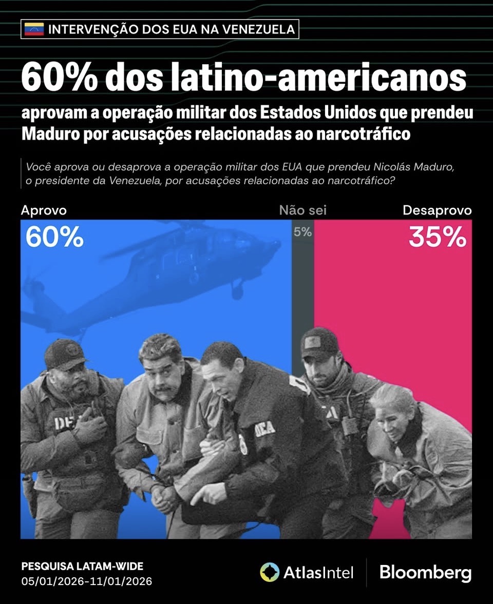 A pesquisa AtlasIntel/Bloomberg divulgada nesta quinta-feira (15) revela um dado que contrasta de forma direta com o discurso predominante de setores da esquerda brasileira sobre a crise venezuelana e a atuação dos Estados Unidos na região. Segundo o levantamento, realizado entre os dias 5 e 11 de janeiro de 2026, 60% dos latino-americanos aprovam a operação militar norte-americana que resultou na prisão de Nicolás Maduro, sob acusações relacionadas ao narcotráfico.