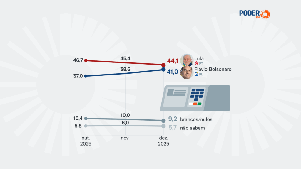 Levantamento do instituto Paraná Pesquisas divulgado nesta sexta-feira, 26 de dezembro de 2025, indica que o presidente Luiz Inácio Lula da Silva (PT) aparece tecnicamente empatado em simulações de segundo turno da eleição presidencial contra nomes ligados à direita. De acordo com o estudo, Lula empata com o ex-presidente Jair Bolsonaro (PL), que atualmente está preso, com o senador Flávio Bolsonaro (PL), com a ex-primeira-dama Michelle Bolsonaro e com o governador de São Paulo, Tarcísio de Freitas (Republicanos). O petista só teria vantagem clara em um eventual confronto direto com a senadora Tereza Cristina (PP).