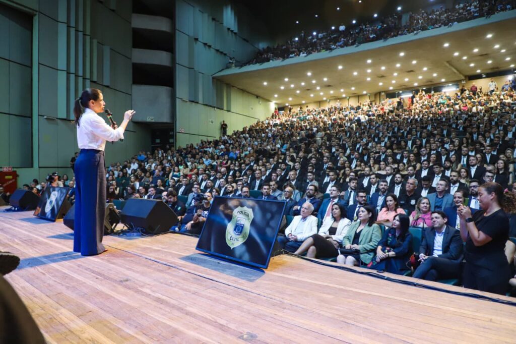 A governadora Raquel Lyra comandou, nesta segunda-feira (10), a solenidade de formatura de 423 novos policiais civis que irão reforçar a segurança pública de Pernambuco. O evento, realizado no Teatro Guararapes, em Olinda, contou com a presença da vice-governadora Priscila Krause, secretários de Estado, parlamentares e familiares dos formandos.