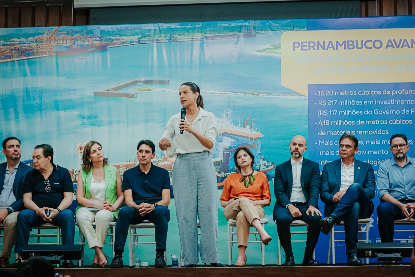 Nesta sexta-feira (30), a governadora Raquel Lyra, ao lado do ministro de Portos e Aeroportos, Silvio Costa Filho, entregaram a dragagem do canal interno do Complexo Industrial Portuário de Suape, que permitirá o atracadouro receber maiores embarcações mundiais com capacidade máxima de carga. A obra recebeu um aporte total de R$ 217 milhões, sendo R$ 117 milhões do Governo de Pernambuco e R$ 100 milhões do Governo Federal, por meio do Programa de Aceleração do Crescimento (PAC-3). A vice-governadora Priscila Krause também participou da entrega.