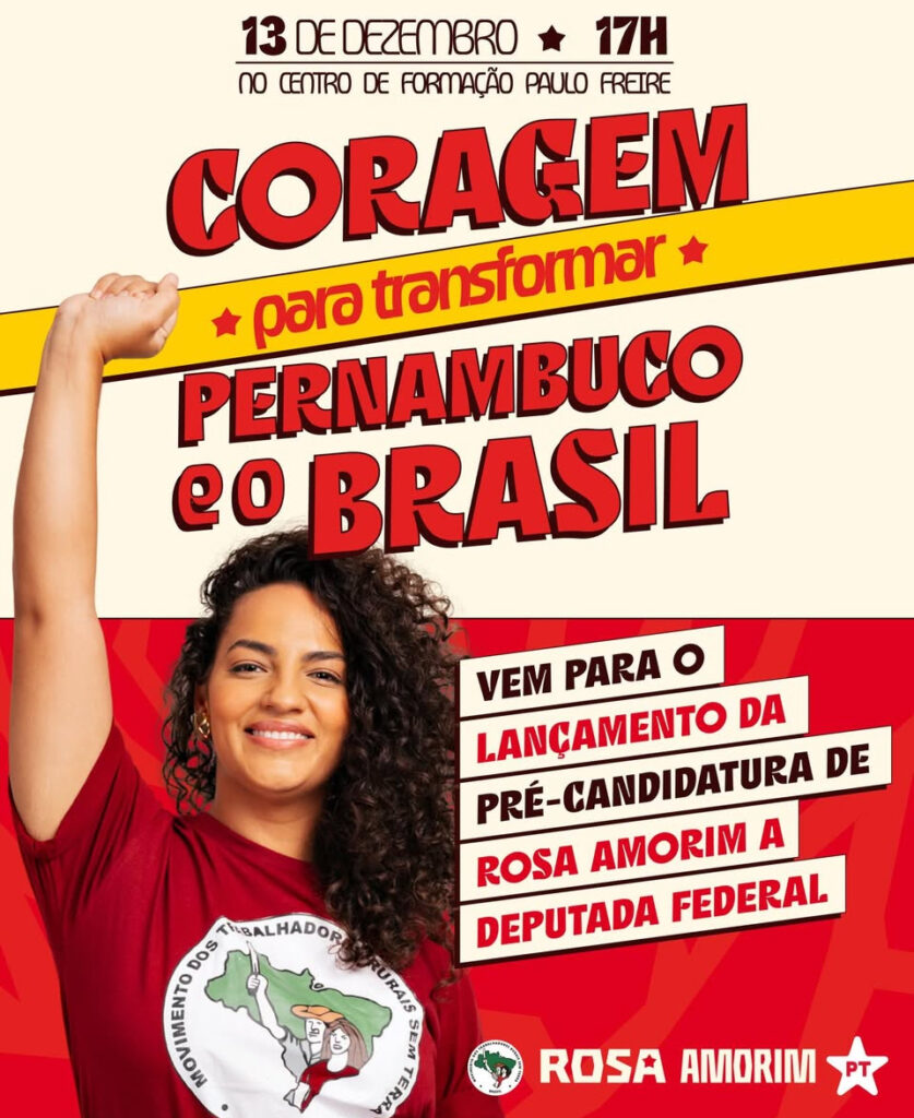 Ligada aos movimentos sociais e com atuação destacada em pautas como juventude, direitos humanos, agricultura familiar e políticas culturais, Rosa Amorim chega ao lançamento reforçando o lema da mobilização — “Coragem para transformar Pernambuco e o Brasil” — frase estampada no material de divulgação do evento. A expectativa é de que lideranças partidárias, militantes, representantes do MST e apoiadores participem do ato, consolidando o início da caminhada rumo a 2026.