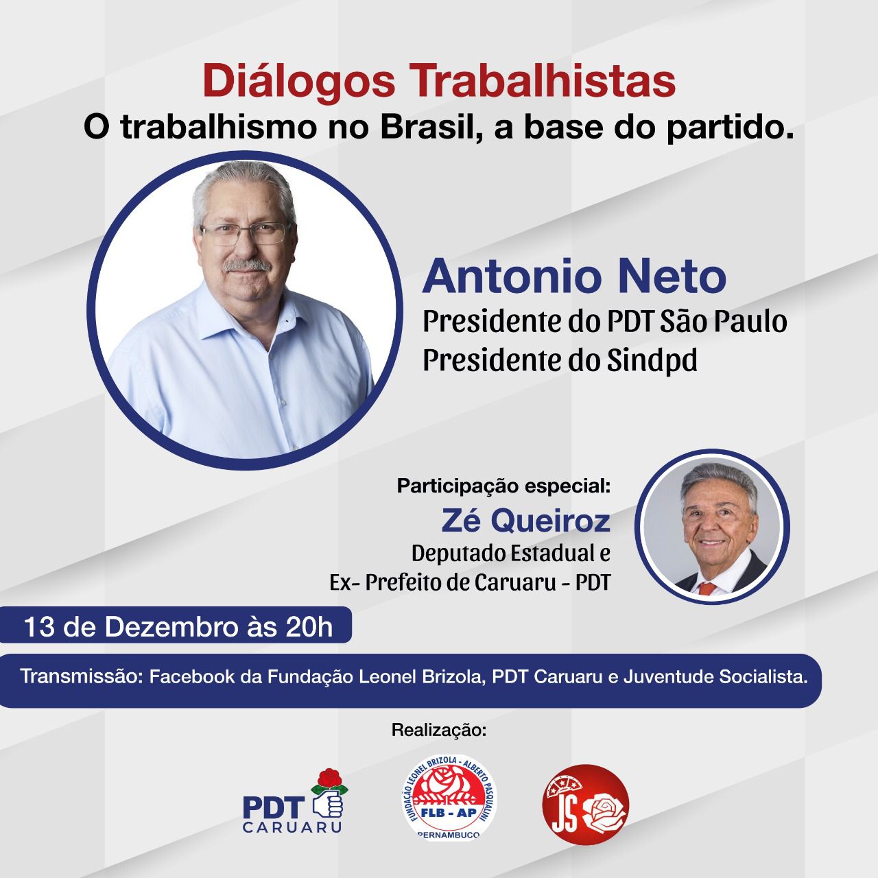 O PDT de Caruaru e a Fundação Leonel Brizola – Alberto Pasqualini e Juventude Socialista realizam nesta segunda-feira (13) uma palestra virtual que terá como convidado o presidente do PDT de São Paulo, Antônio Neto. O tema do debate é “O Trabalhismo no Brasil, a base do Partido”. O evento virtual contará também com a […]