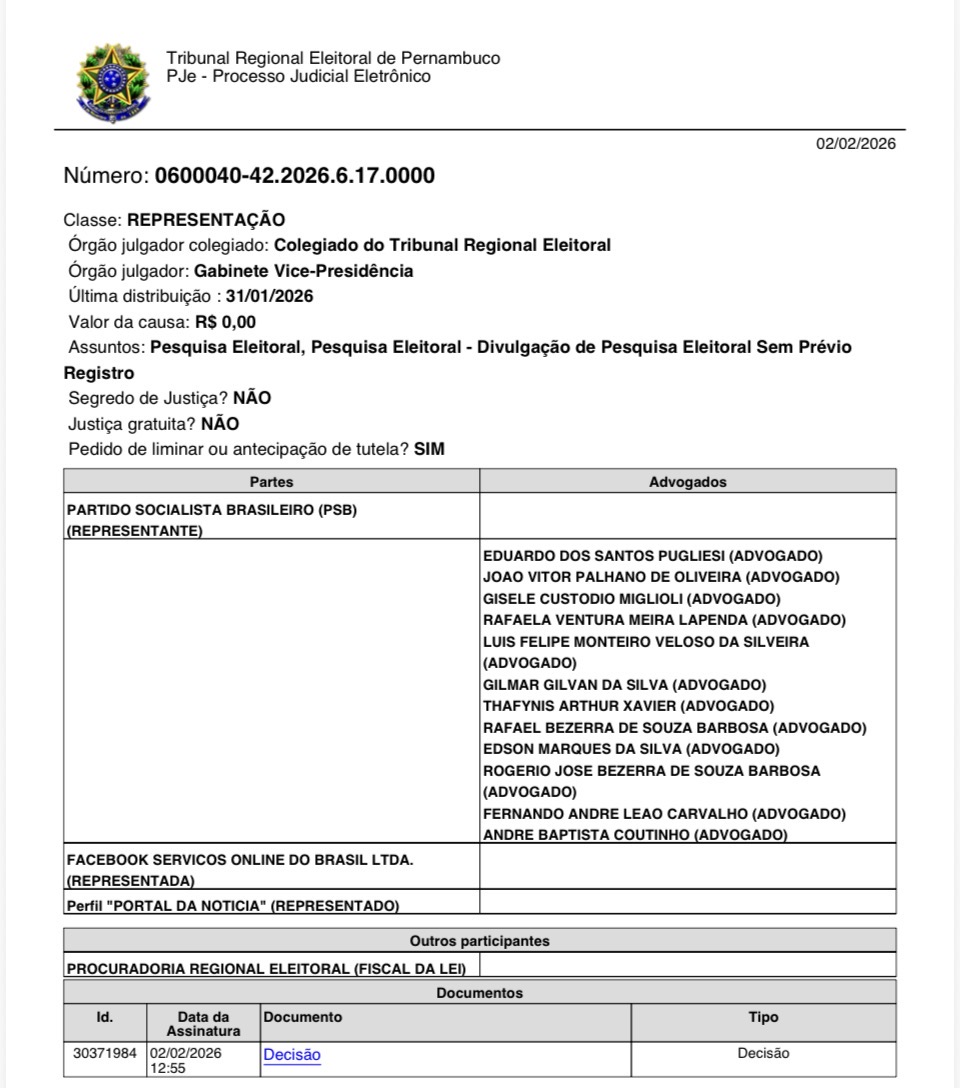 A liminar foi concedida pelo desembargador Paulo Augusto Freitas de Oliveira, do TRE-PE, em ação proposta pelo PSB. Na avaliação do magistrado, a divulgação de percentuais atribuídos a pré-candidatos, sem registro no sistema PesqEle, configura infração à legislação eleitoral. Na decisão, ele destacou que a ausência de informações como margem de erro, nível de confiança, período de coleta, número de entrevistas e identificação do responsável compromete a regularidade da publicação.