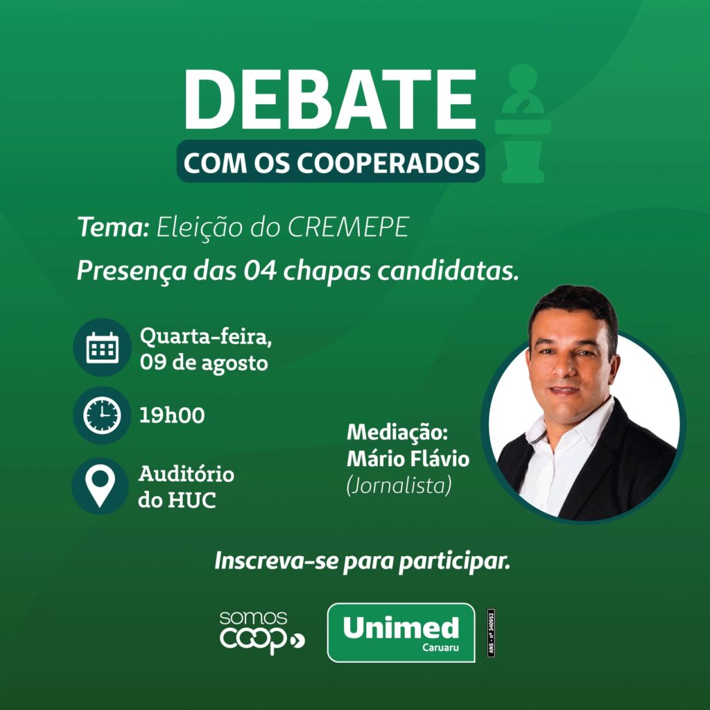 O debate será transmitido ao vivo pelo YouTube da Unimed e terá cinco blocos. Confirmaram presença: Chapa Ética e Ciência, Chapa Renovação e União, Chapa Movimentação e União e Liberta Cremepe.