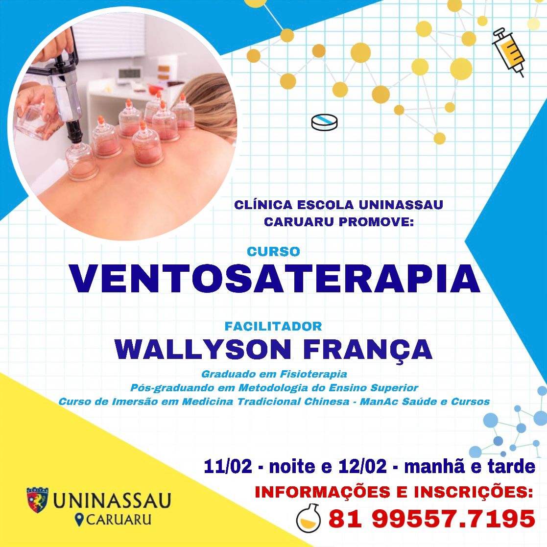 A Faculdade UNINASSAU Caruaru realiza, por meio da Clínica-Escola de Fisioterapia, nos dias 11 e 12/02, o curso de Ventosoterapia. A técnica é baseada na aplicação de copos de vidro ou acrílico no corpo do paciente, com a finalidade de criar um vácuo e gerar uma pressão negativa que atua na área com fins terapêuticos. Neste curso de extensão de 15 horas, o aluno aprende como usar o equipamento, que fornece alívio imediato para dores e inflamações, além de devolver à paciente mobilidade e a performance necessária.