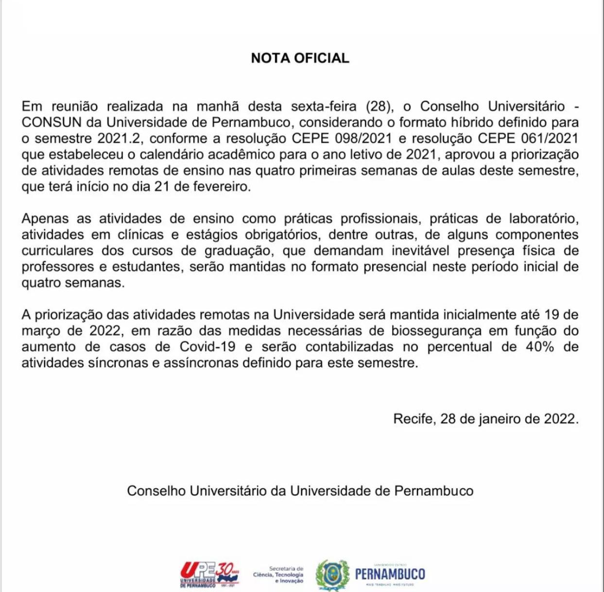 “Em reunião realizada na manhã desta sexta-feira (28), o Conselho Universitário (CONSUN) da Universidade de Pernambuco, considerando o formato híbrido definido para o semestre 2021.2, conforme a resolução CEPE 098/2021 e resolução CEPE 061/2021 que estabeleceu o calendário acadêmico para o ano letivo de 2021, aprovou a priorização de atividades remotas de ensino nas quatro primeiras semanas de aulas deste semestre, que terá início no dia 21 de fevereiro.