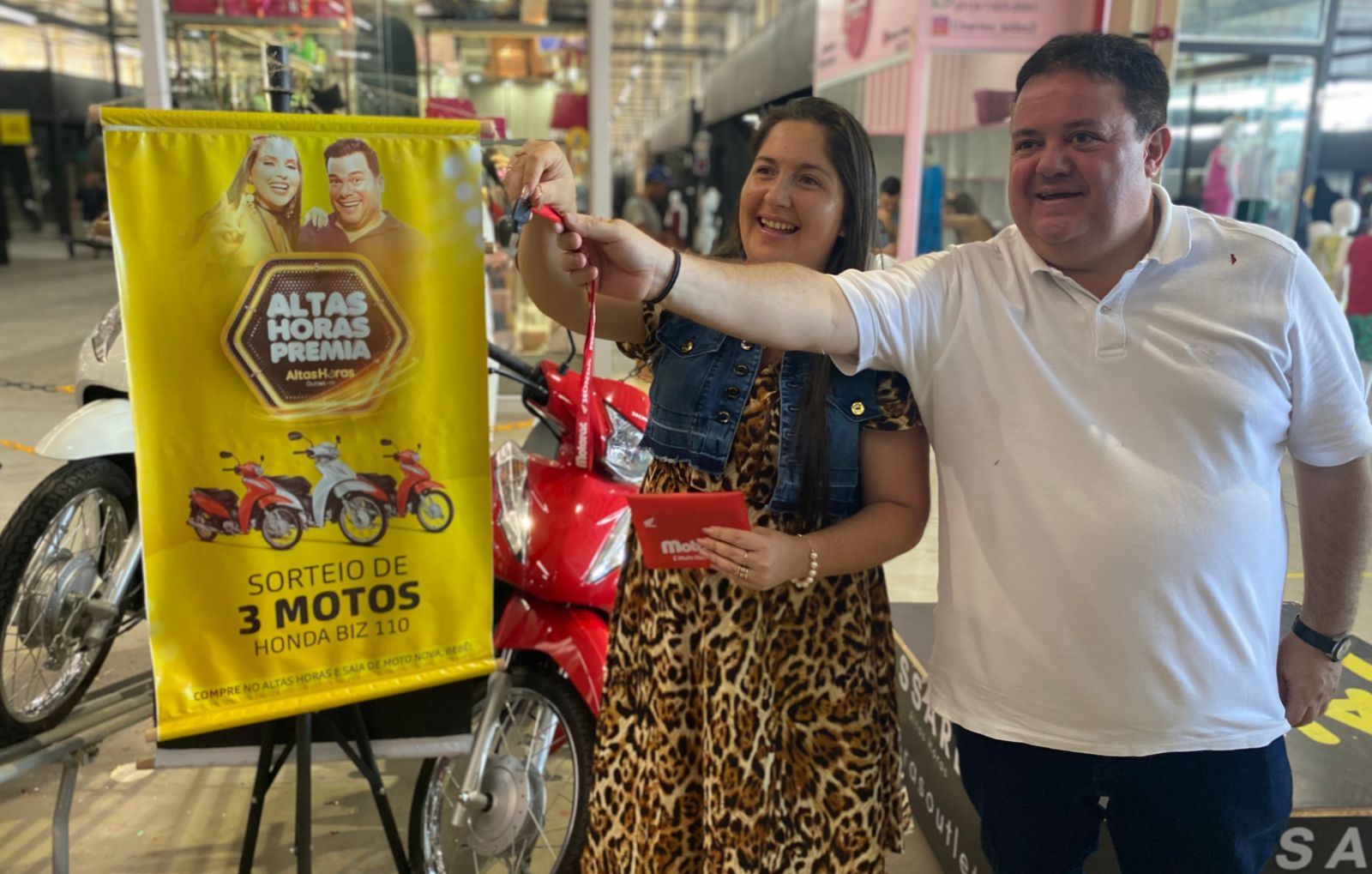 Dia de comemoração no Altas Horas Outlet. A vencedora da primeira moto do Altas Horas Premia recebeu o veículo nesta quinta-feira (13), no empreendimento. A grande vencedora foi Viviane Lima, da cidade de Carmópolis, localizada no estado de Sergipe, que recebeu das mãos de Neves Neto, um dos diretores da Incorporadora Altas Horas, a chave da moto.