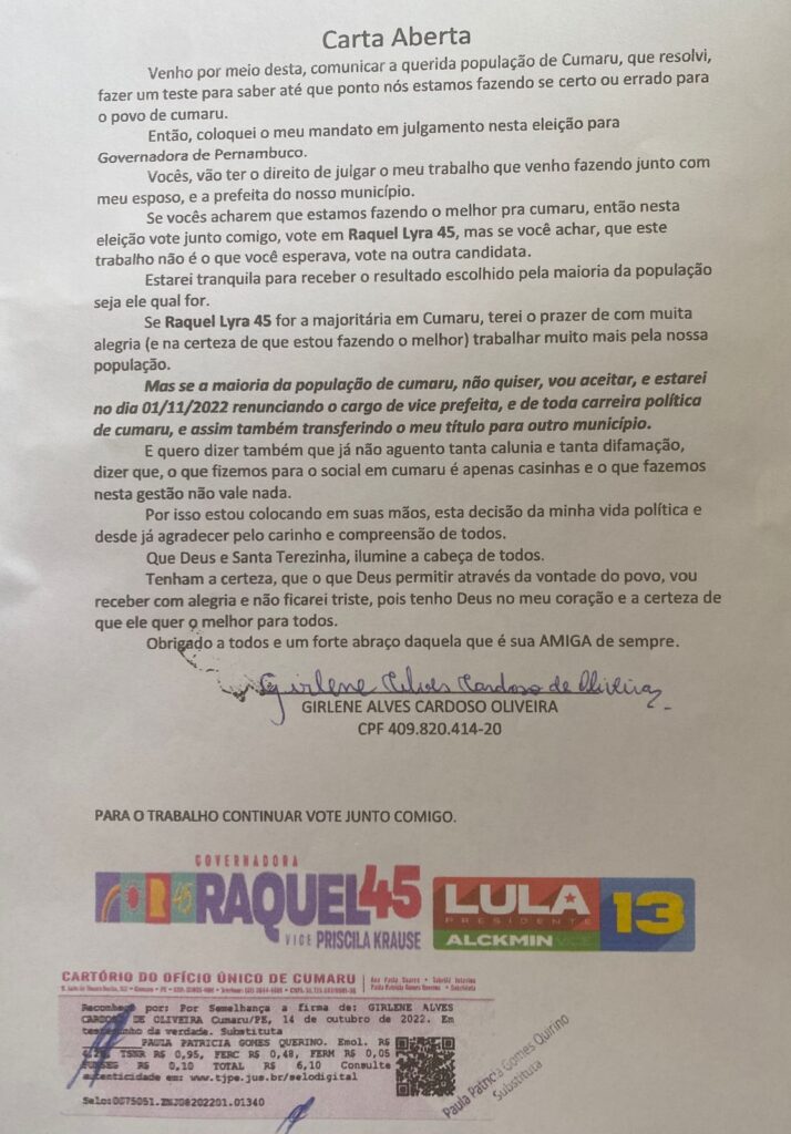 Uma situação inusitada na cidade de Cumaru, no Agreste de Pernambuco. A vice-prefeita da cidade, Girlene Alves, escreveu uma carta aos eleitores do município e garante que se Raquel Lyra (PSDB), não tiver mais votos que Marília Arraes (SD), na cidade, ela renúncia ao mandato. E não parou por aí.